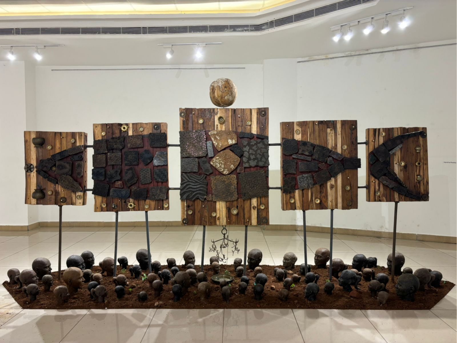 Another woman artist, Harsha Kanchala’s installation that greets you at the very door is not of soothing marigolds and roses, but of cloth masks that have now become part of our psyche. There is a sense of urgency as she puts these nearly 2000 cloth masks that she gave around at local schools and asked children to write their deepest wishes for the planet that they will inherit. Some of these messages and drawings are heartfelt pleas from the young to stop ozone depletion and deforestation so that they may wake up to a healthier planet.