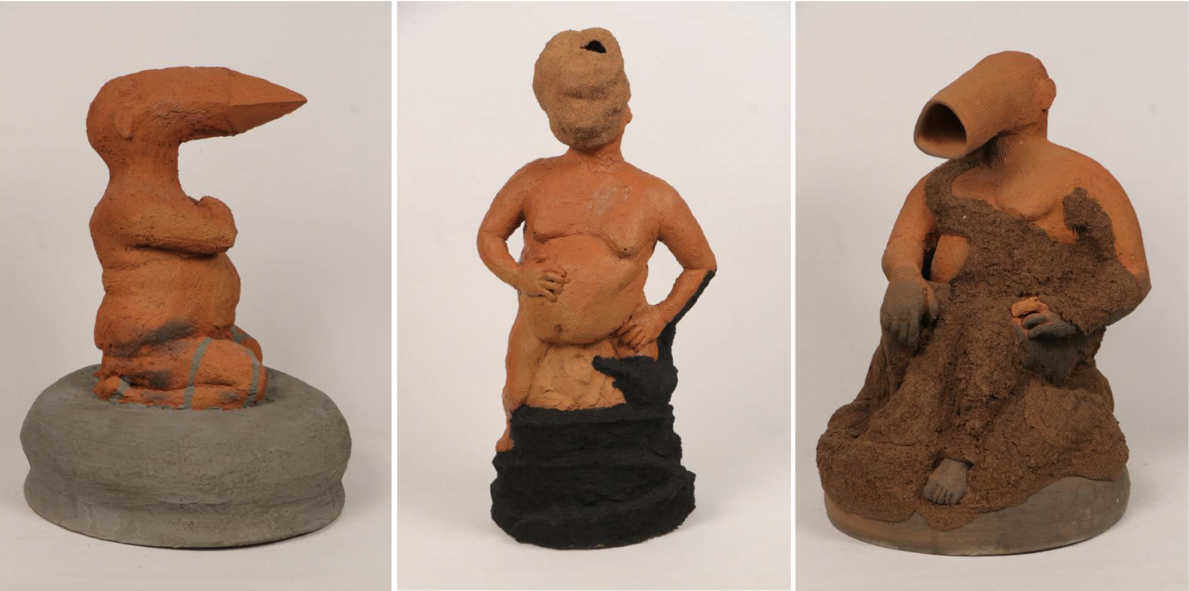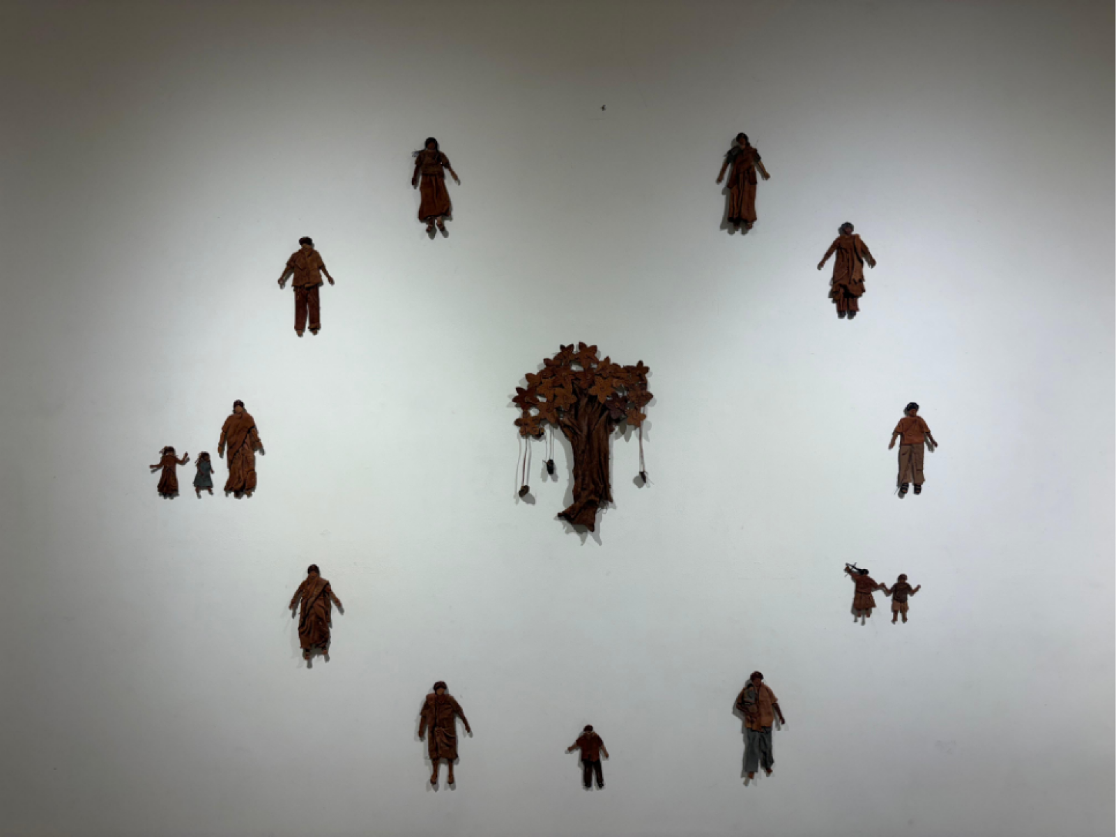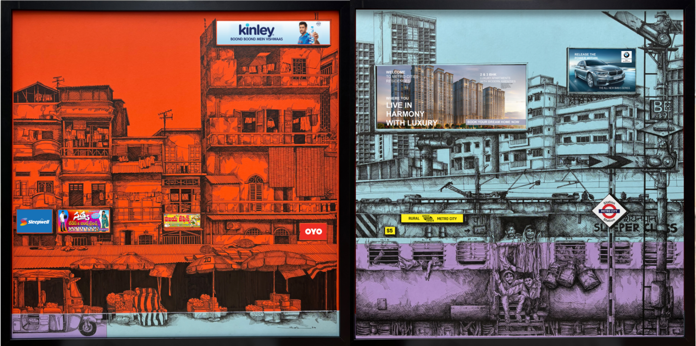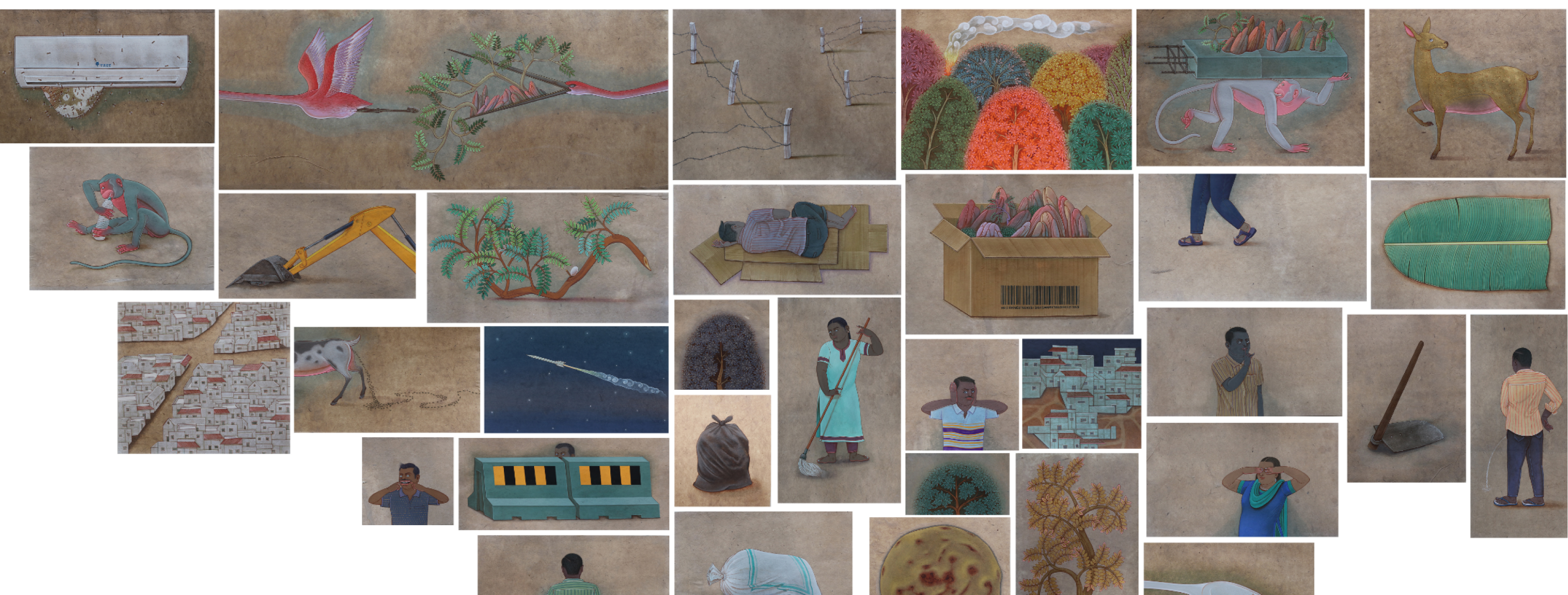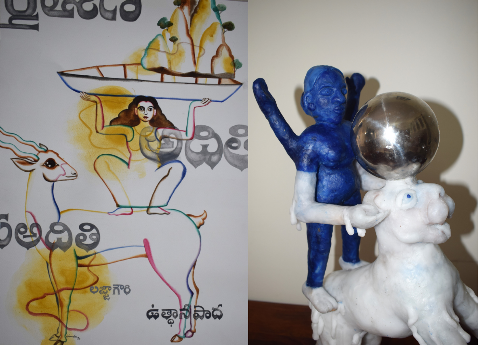 The rapid urbanization and migration from villages to cities has caused other problems of overcrowding, and these occupy Bharath’s mind: in his massive installation, he depicts a bullock cart from his rural memory that is burdened and overladen with a concrete jungle. Is urbanization diminishing the idyllic dream of a rural life, he seems to ask through his work. Mahesh Pottabathini who hails from a weaving community in Telangana also dreams of a bygone time when each home had a loom and wove their own cloth thus being self-sufficient. Even while memories of farmer deaths caused by droughts haunt his works, he also depicts a couple, probably his own parents from a time gone by, in a self-sufficient rural economy that the great environmentalist and advocate of sustainable rural economies -- Gandhi once thought was ideal for India.