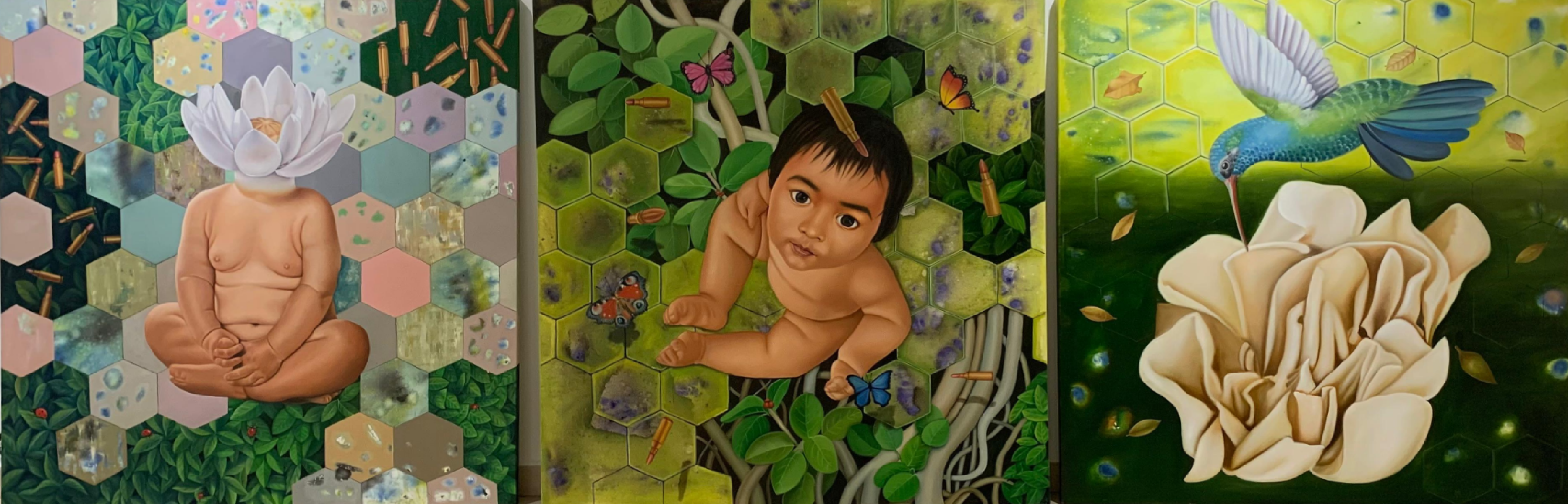What shrinking forests and lack of oxygen can do is worrying, and concerns many of the artists in the show. In Ramesh Baikani’s installation and paintings there are stunted babies as in the Thalidomide disaster in America which caused the birth of stillborn babies and children with deformities. If his 6ft by 5 ft fiber glass sculpture of a stillborn baby does not bring the viewer to a standstill, imagining a world of stunted and aborted foetuses, then surely, nothing will.